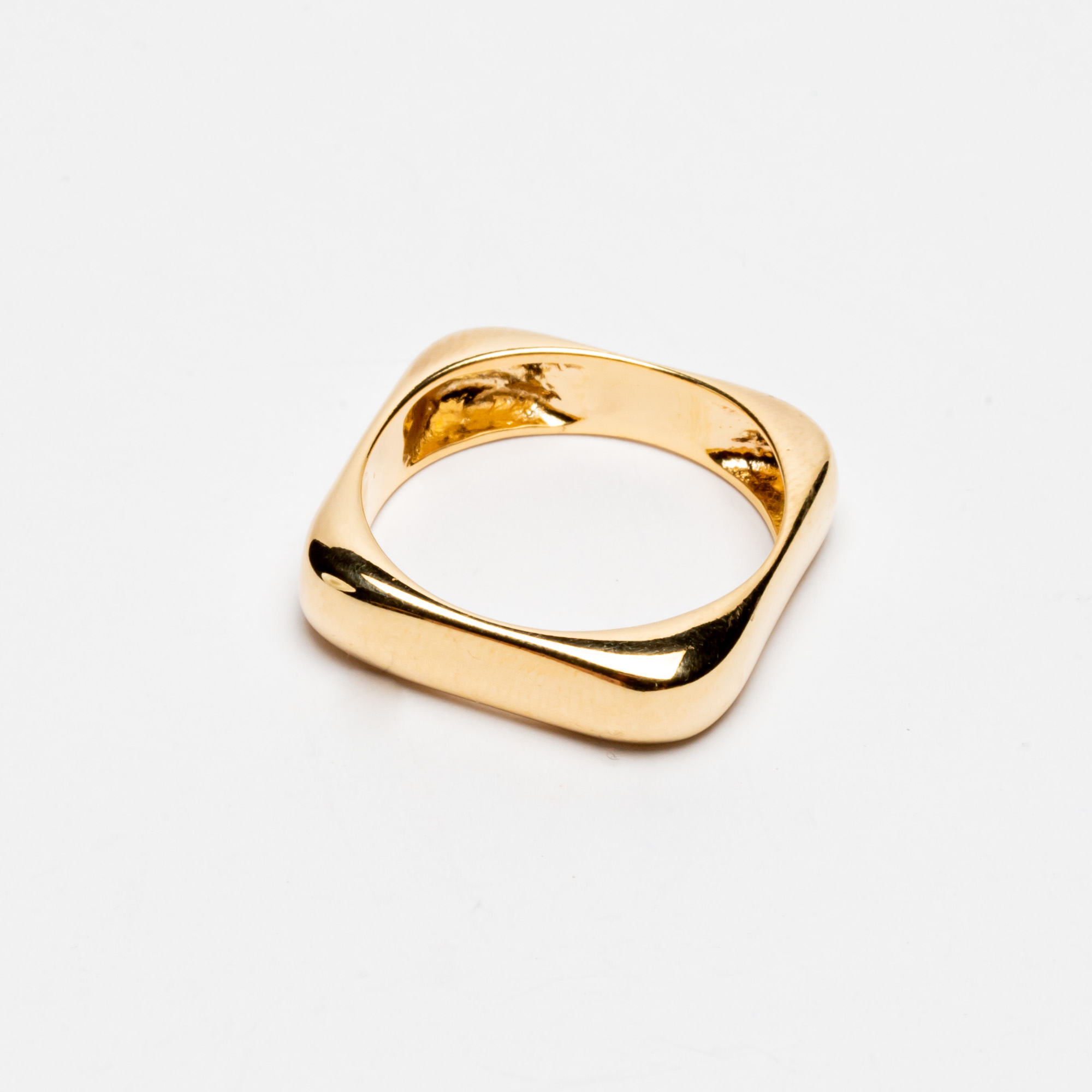 Anel em formato quadrado com as quinas boleadas, ele é liso sem cravejamento e banhado a ouro 18k e ródio branco. Esse anel é super versátil combinando com vários look´s e de fácil composição.
