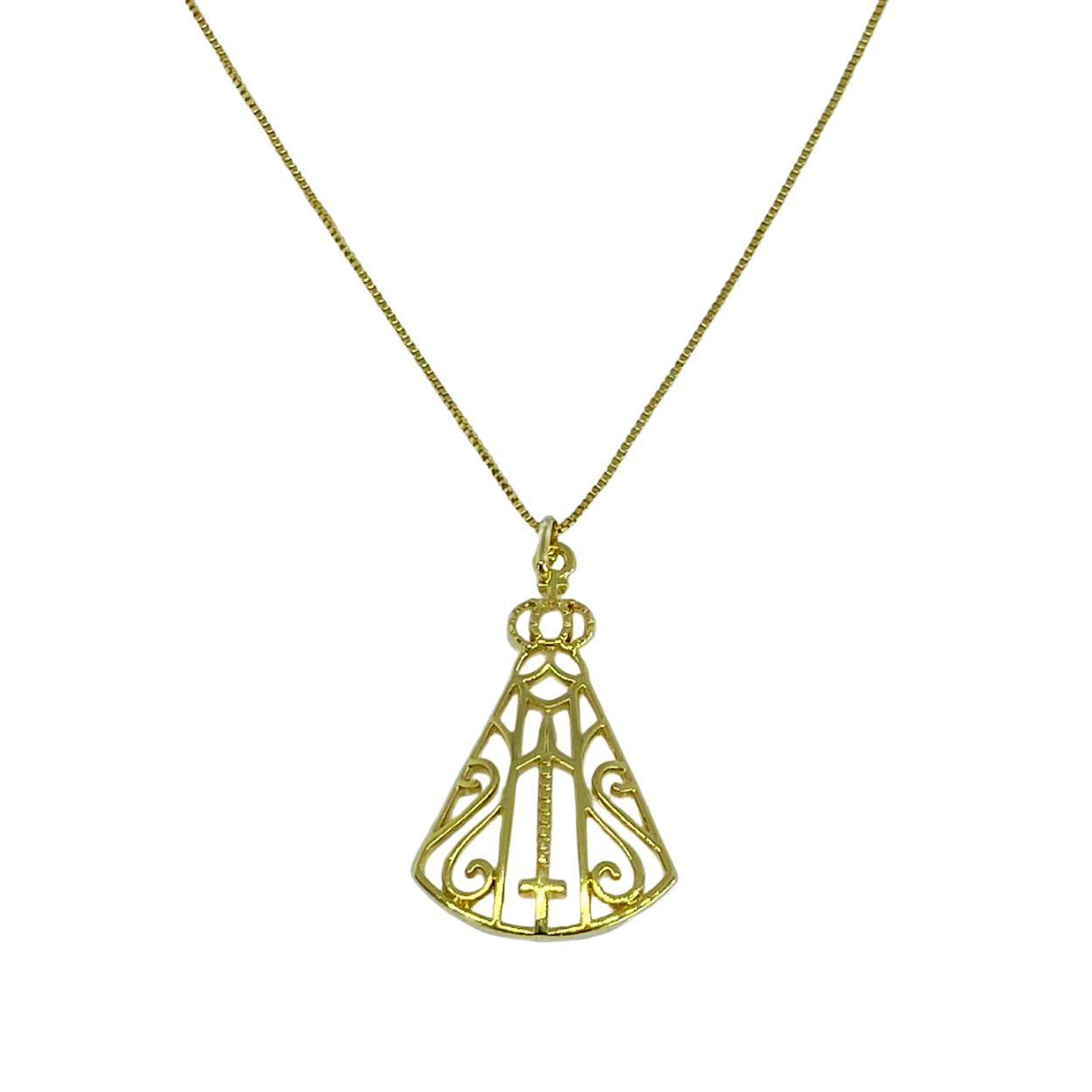 Colar com pingente de Nossa Senhora Aparecida trabalhada e vazada. Banhada a ouro 18K ,prata e ródio branco. Fortaleça sua fé com esse colar maravilhoso!