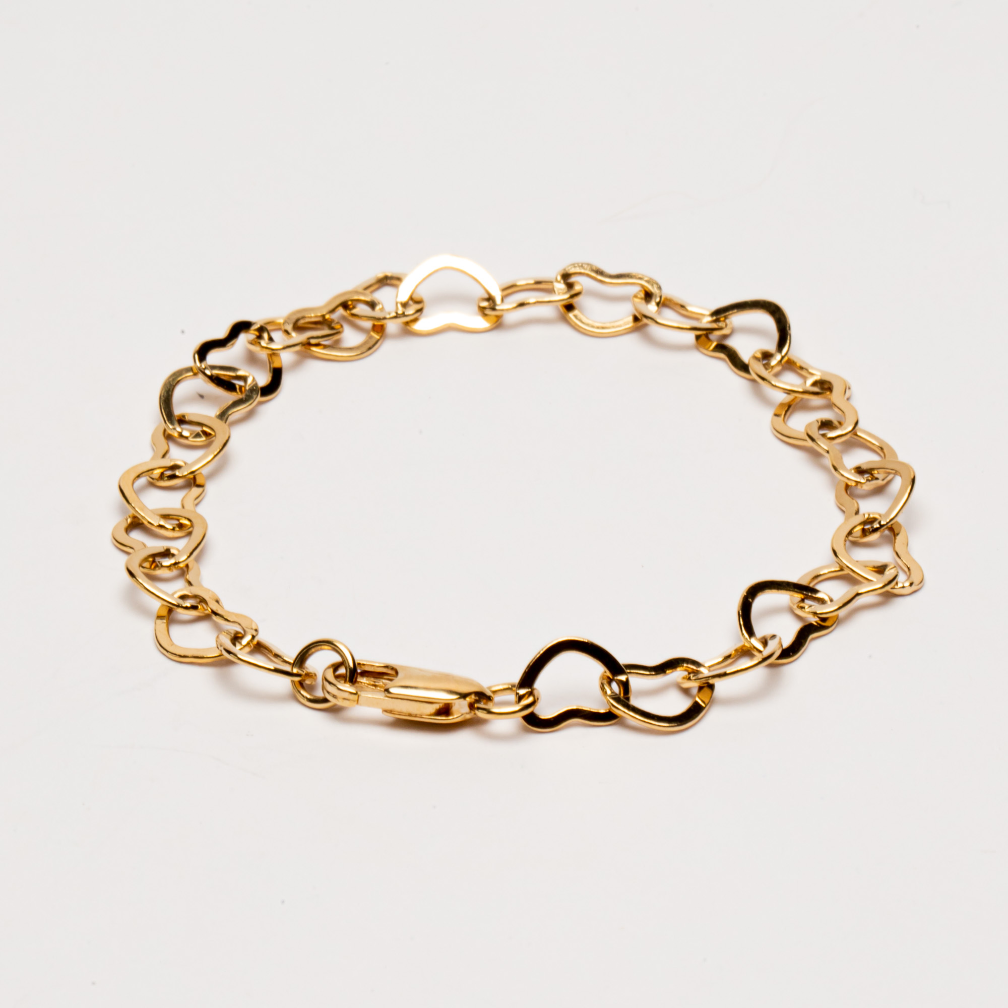 Pulseira com elos de coração. Banhada a ouro 18K e a ródio branco. Peças com coração transmitem amor e graciosidade. Ela possui antialérgico e 6 meses de garantia quanto ao banho.